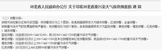 與此相對應(yīng)的,是各省份2013年至2014年發(fā)布的重污染天氣應(yīng)急預(yù)案。河南省、山東省、河北省的預(yù)案分級略有不同。如山東預(yù)警分為“黃、橙、紅”三級,河南、河北則有四級預(yù)警。但對“紅色預(yù)警”的規(guī)定相同,均是“當(dāng)預(yù)測1天及以上發(fā)生極嚴重污染天氣時(AQI≥500),發(fā)布紅色預(yù)警。”