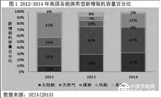 美國是世界上較早發(fā)展分布式光伏發(fā)電的國家之一。2006年美國有6000多座分布式發(fā)電站,200多個(gè)大學(xué)校園采用了分布式發(fā)電站供電。目前,分布式光伏在美國能源利用中扮演著越來越重要的角色。截至2014年末,美國光伏發(fā)電裝機(jī)總量達(dá)20GW,其中分布式光伏超過16.lOGW。新增光伏發(fā)電裝機(jī)僅次于天然氣(圖1),住宅光伏裝機(jī)首次超過非住宅光伏(SEIA,2015)。