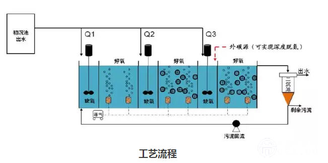 以三段A/O進(jìn)水方案為例,工藝流程為:由3段缺氧/好氧順序排列組成,其中好氧第二段和第三段均投加20%—30%的懸浮生物填料。原水分三段進(jìn)入各缺氧區(qū),Q1:Q2:Q3為40%:30%:30%(流量分配比可根據(jù)水質(zhì)水量進(jìn)行優(yōu)化調(diào)節(jié)),回流污泥回流到系統(tǒng)的首端。第一段的缺氧區(qū)利用進(jìn)入該區(qū)污水Q1中的碳源對(duì)回流污泥中的NOx-N進(jìn)行反硝化,然后,混合液流入第一段的好氧區(qū)進(jìn)行硝化反應(yīng);反應(yīng)后的混合污水流入到第二段的缺氧區(qū),利用進(jìn)入該區(qū)污水Q2中的碳源進(jìn)行反硝化,混合液再進(jìn)入到第三段的好氧區(qū)進(jìn)行硝化反應(yīng),以后各段以此類推。