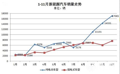 其中,本月純電動車型銷售達到17065輛,同比增長231%;插電混合動力車型銷量達到7599輛,同比增長262%;從分布看,純電動車型依舊 占據(jù)較大優(yōu)勢,本月占比達69%,而插電式車型占比31%。1-11月累計銷量,純電動車型達8.5萬輛,插電式車型達5.4萬輛。雖然插電混動總量表現(xiàn) 弱于純電動轎車,但其今年增速表現(xiàn)相對較快(從5月開始至9月銷量連續(xù)攀升,經(jīng)過10月小幅下降,在本月創(chuàng)下新高。)。純電動車型銷量走勢則類似于乘用車 總體銷量趨勢,從8月至今表現(xiàn)較強增勢。