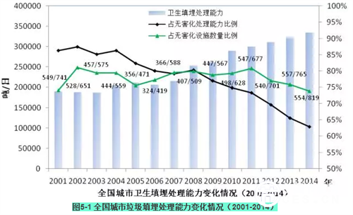 “十二五”期間隨著焚燒設(shè)施的不斷推進建設(shè),盡管填埋處理的比例穩(wěn)步下降,但填埋場中衛(wèi)生填埋場的比例明顯上升。同時,填埋氣體導(dǎo)排及綜合利用技術(shù)逐步得以采用并不斷完善,滲濾液達標(biāo)排放、臭氣全過程控制等技術(shù)也趨于成熟。填埋場從單純的處理處置功能逐步向資源能源利用等多功能方向發(fā)展,處理規(guī)模也從小型填埋場逐步向大型高標(biāo)準(zhǔn)填埋場過渡。