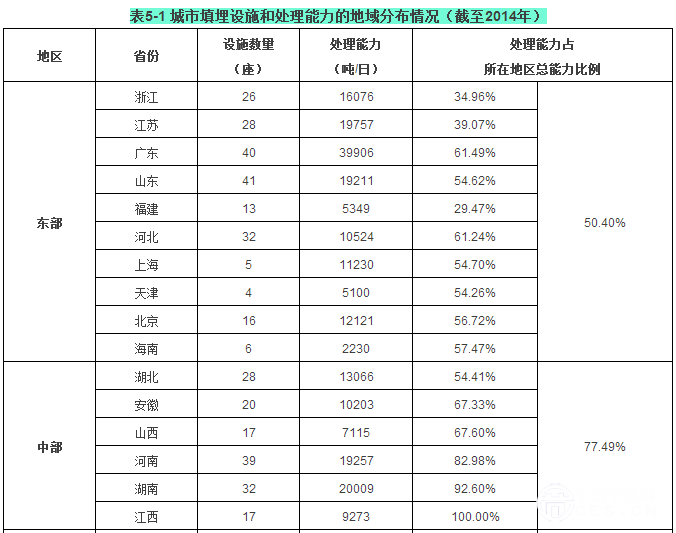 截止至2014年12月底,我國各省份運營垃圾填埋場情況如下表所示,全國范圍內(nèi)填埋設(shè)施主要集中在人口相對集中、密度較大的東部發(fā)達地區(qū),占全國填埋總處理能力的42.24%。但東部發(fā)達地區(qū)由于經(jīng)濟發(fā)展水平較高,大力發(fā)展了垃圾焚燒技術(shù),填埋處理能力占各地區(qū)無害化設(shè)施處理總能力比重最低,平均在50.40%,其中福建占比最低,至29.47%。北京、上海等經(jīng)濟相對發(fā)達的城市規(guī)劃了原生垃圾零填埋的指導(dǎo)目標(biāo),目前在建大量垃圾焚燒設(shè)施,設(shè)施全部投入運行后,預(yù)計未來焚燒能力將達90%以上,垃圾填埋的比重將大大降低。
