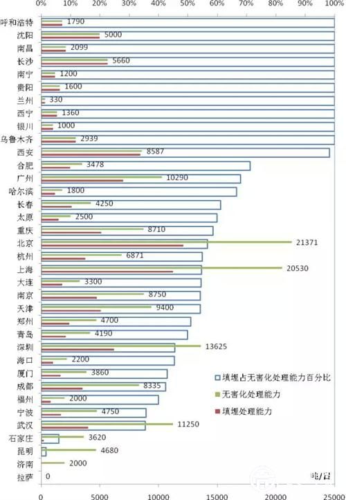 本報告針對人口100萬以上的大型城市、I型大城市、特大城市和超大城市中的36個大城市的填埋處理情況進行了分析,這36個城市填埋處理能力為113760噸/日,占無害化處理能力198025噸/日的 57.45%,比全國65.42%平均占比略低。截止到2014年年底,呼和浩特、沈陽、南昌、長沙、南寧、貴陽、蘭州、西寧、銀川、烏魯木齊等10個大城市全部采取了填埋處理方式,其中西安、合肥、廣州、哈爾濱等4個大城市填埋處理占比大于65%。其余城市填埋占比均小于65%,石家莊、昆明填埋處理占比小于10%;2014年,濟南垃圾無害化處理一廠垃圾已經(jīng)飽和、封場,同時,衛(wèi)生填埋三廠在建,因而濟南垃圾基本全部由二廠焚燒處理方式,而據(jù)統(tǒng)計,拉薩目前垃圾尚未進行無害化處理。