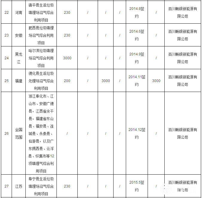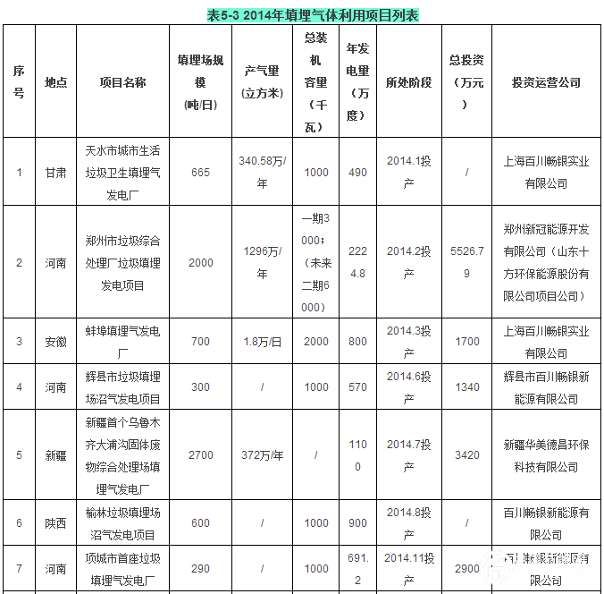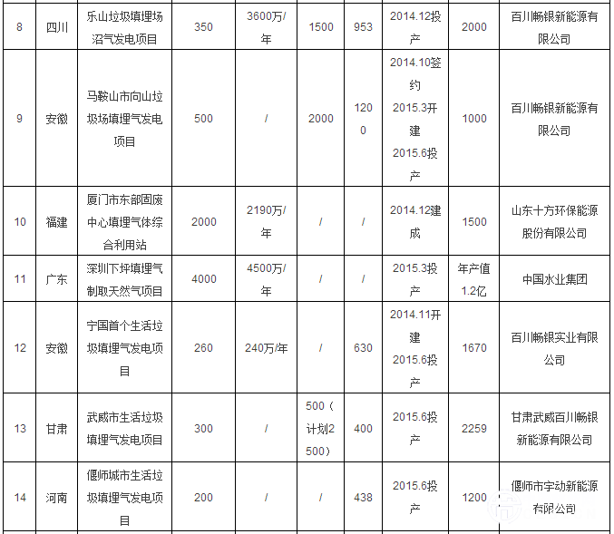 2014年1月至2015年8月,據(jù)不完全統(tǒng)計,國內(nèi)填埋氣體利用項目建設(shè)、投產(chǎn)情況如下表所示,投產(chǎn)或建成項目共15項。其中,發(fā)電項目13項,累計年發(fā)電量10835萬度,山東十方投資的鄭州首座填埋氣發(fā)電項目年發(fā)電量最大,達2224.8萬度,百川暢銀公司投產(chǎn)運行的項目最多,合計8項;提純制天然氣2項,累計年提純天然氣6690萬立方,其中國水業(yè)集團投資深圳下坪項目將國內(nèi)最大填埋氣制取天然氣項目,天然氣年產(chǎn)量達4500萬立方。此外,在建、招標(biāo)、簽約項目累計達27項,其中,百川暢銀公司具有市場領(lǐng)先優(yōu)勢,同時,該公司還于2014年5月收購了北京六里屯垃圾填埋氣發(fā)電項目,為北京最大的填埋氣發(fā)電項目,每天發(fā)電16萬度。