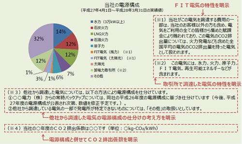 經(jīng)產(chǎn)省就利用FIT制度而產(chǎn)生的電力總結(jié)道:“因其是由全體國(guó)民負(fù)擔(dān)而得以導(dǎo)入的,所以其二氧化碳零排放的環(huán)境價(jià)值要屬于全部用戶”。因此,在表述電源構(gòu)成時(shí),不能說(shuō)是“可再生能源”,而要用“FIT電力”之名,用不強(qiáng)調(diào)環(huán)境價(jià)值的方式說(shuō)明。