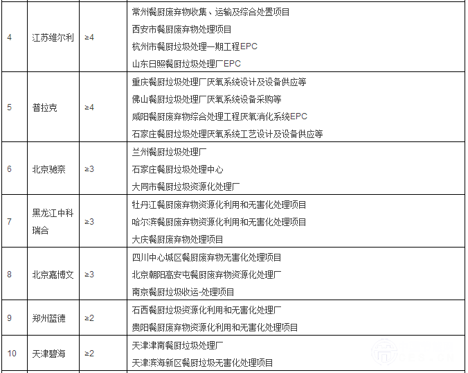 國內(nèi)餐廚垃圾處理市場參與企業(yè)眾多,但隨著建設(shè)項目的增多,龍頭企業(yè)逐步顯現(xiàn)。根據(jù)統(tǒng)計到的81座已知項目承建單位的餐廚垃圾處理設(shè)施(50t/d以上,部分由聯(lián)合體公司建設(shè)),參與餐廚垃圾處理設(shè)施建設(shè)的單位至少有54家,其中有2座及2座以上餐廚垃圾處理設(shè)施承建經(jīng)驗(yàn)的單位約有15家,參與過46座餐廚垃圾處理設(shè)施的建設(shè),占比53.5%(見圖7-4)。包括:桑德環(huán)境承建7座,青海潔神、山東十方、江蘇維爾利、普拉克各參建4座,北京馳奈、黑龍江中科瑞合、北京嘉博文各承建3座,鄭州藍(lán)德、天津碧海、中聯(lián)重科、重慶市環(huán)衛(wèi)集團(tuán)、江蘇潔凈、錦江集團(tuán)、寧波開誠等至少各承建2座(如表7-3所示)。