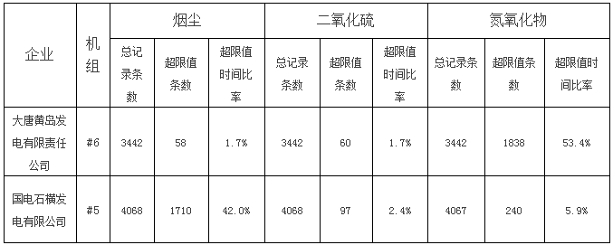 表1.部分電廠總運(yùn)行小時數(shù)、超過“超低排放”限值的排放小時數(shù)及超限值占總運(yùn)行小時數(shù)的時間比率