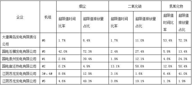 國電泰州發(fā)電有限公司的1號機(jī)組分別有53個小時、36個小時和92個小時的煙塵、二氧化硫和氮氧化物排放超過了超低排放限值的記錄。雖然該燃煤電廠的三種大氣污染物超過超低排放限值的時間占總運(yùn)行小時的比率均低于5%,但該段時間內(nèi)排放的大氣污染物卻分別占到總排放量的39.4%、12.1%和24.3%。此次調(diào)查中還有另外4家燃煤電廠的一種或多種大氣污染物超過超低排放限值期間的排放量占到其運(yùn)行期間總排放量的39.4%至72.3%。