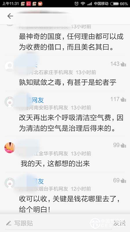 顯然,荊楚網(wǎng)上的一篇文章更能代表小伙伴的心聲:上海嘗試征收霧霾費,未必是一樁好買賣。“一煤獨大”或“一鋼獨大”是大城市的標簽,也是霧霾產(chǎn)生的重點對象。這些重點對象是地方經(jīng)濟的支柱,投鼠忌器,想必也是霧霾橫行的護身符。我們必須明確一個問題,凡事大型工業(yè)幾乎都是國有企業(yè)。政府部門對國有企業(yè)收費,無疑把錢從左手邊拿到右手邊而已。但是,工業(yè)產(chǎn)品的價格就會帶入一定的霧霾費,無形之中,加重了社會大眾的生活負擔(dān),工業(yè)卻受不到任何影響,甚至?xí)黾幼陨砉I(yè)的凈收入。