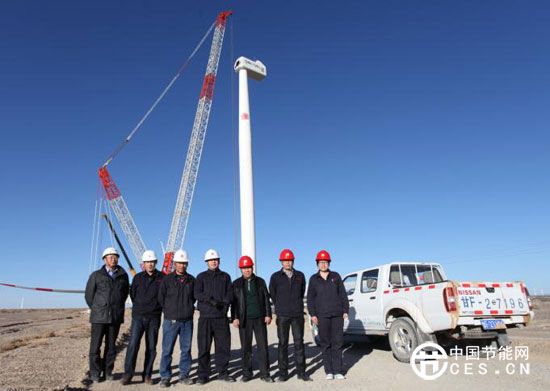 12月16日早,大唐新能源甘肅公司瓜州北大橋項(xiàng)目部和施工單位七名工程技術(shù)人員,在該項(xiàng)目最后一臺(tái)風(fēng)機(jī)葉片吊裝之前合影留念。