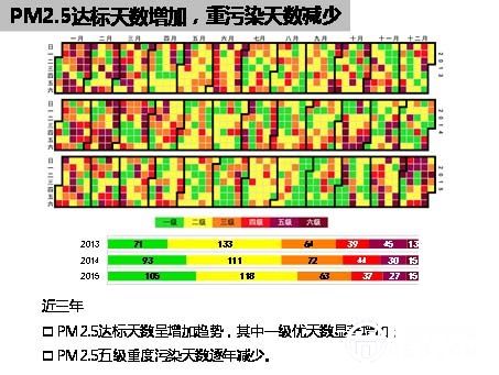 2015年空氣質(zhì)量達(dá)標(biāo)天數(shù)186天,占全年天數(shù)的51%,較2014年增加14天,其中一級優(yōu)的天數(shù)增加13天;2015年重污染共46天,占13%,較2014年減少1天。