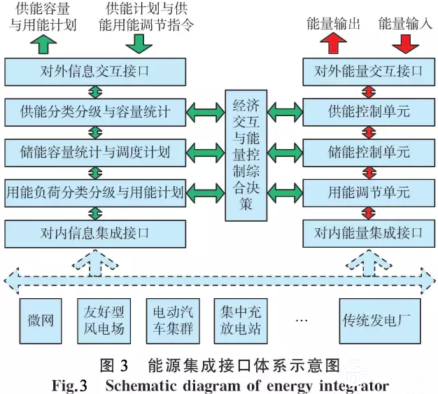 與能源路由器采用一致的技術(shù)和裝置實(shí)現(xiàn)能量的靈活互動不同, 不同的能源節(jié)點(diǎn)雖然向上對系統(tǒng)可呈現(xiàn)相似特征, 但由于內(nèi)部機(jī)理迥異, 難以通過統(tǒng)一的技術(shù)和裝置實(shí)現(xiàn)。因此, 節(jié)點(diǎn)入網(wǎng)的統(tǒng)一接口體系應(yīng)該是一個開放概念, 只針對功能和協(xié)議層面進(jìn)行統(tǒng)一, 而對具體實(shí)施技術(shù)開放。因此, 將其稱為能源集成接口體系(Energy Integrator), 以區(qū)別于具體裝置。而能源路由器可以是其某種具體實(shí)施技術(shù), 或技術(shù)方案的一部分。