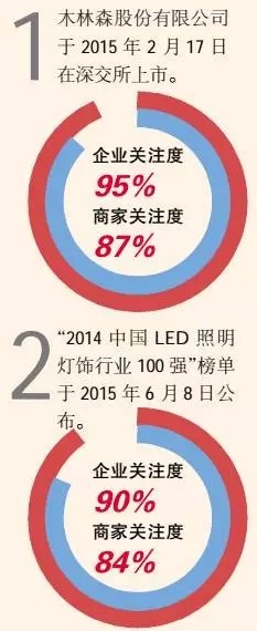 從以上我們不難看出,“木林森股份有限公司于2015年2月17日在深交所上市”的企業(yè)關(guān)注度達(dá)95%,商家關(guān)注度達(dá)87%。作為行業(yè)新秀,木林森的迅猛發(fā)展靠的不僅僅是資金實(shí)力,還有市場美譽(yù)度與品牌知名度;上市之后木林森的一舉一動,更是成為廠商關(guān)注的焦點(diǎn)。