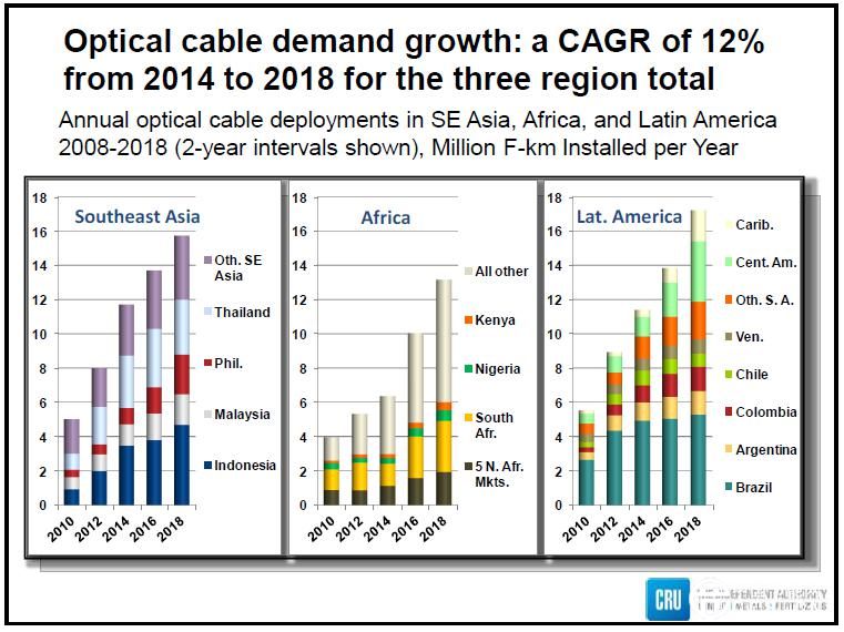 共有三個區(qū)域?qū)饫|制造商需求較高——即東南亞、非洲和拉丁美洲,這三者均是光纜凈進(jìn)口國。這三個地區(qū)總計包括100多個國家,其中只有12個國家擁有自己的光纜制造廠。其2014年光纜需求總量為3000萬纖芯公里。此數(shù)字相當(dāng)于中國2014年需求總量的20%。但這三個區(qū)域仍具備較強的增長潛力,相信隨著運營商們?yōu)樘嵘髯怨潭ê鸵苿訉拵Х?wù)而不斷擴大并升級網(wǎng)絡(luò),預(yù)計未來五年的年均增長率將超過10%。