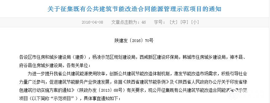 陜西省關(guān)于征集既有公共建筑節(jié)能改造合同能源管理示范項目的通知已經(jīng)下發(fā)。