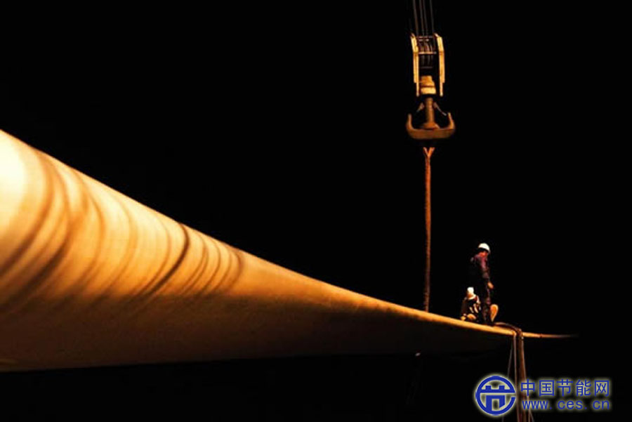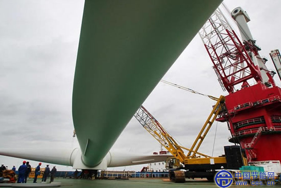當(dāng)日,國電龍?jiān)唇K如東30兆瓦海上(潮間帶)試驗(yàn)風(fēng)電場擴(kuò)建工程現(xiàn)場成功吊裝了大型風(fēng)電機(jī)葉片。該復(fù)合材料風(fēng)電葉片長73.5米,風(fēng)輪直徑151米。新華社發(fā)(許叢軍 攝)