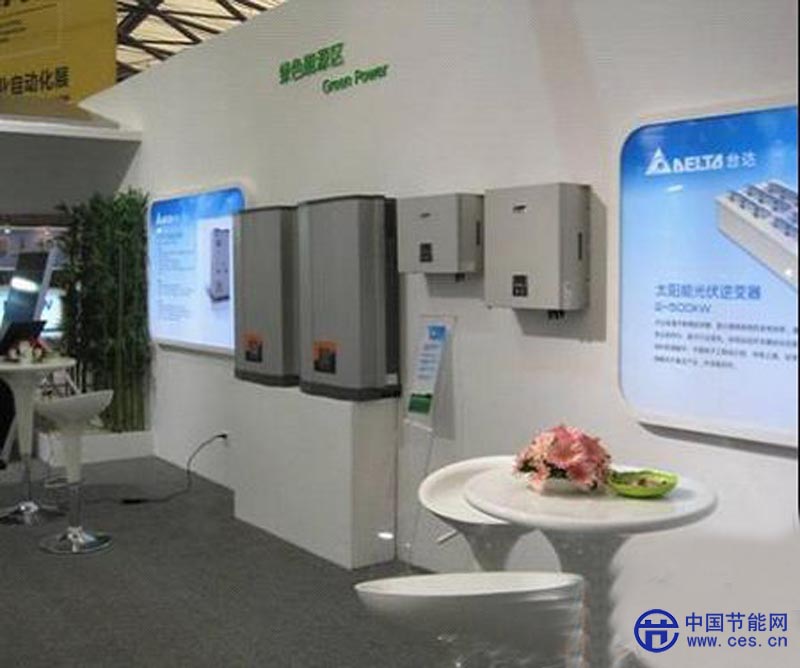 展臺(tái)的二樓,是綠色能源區(qū),展示了中達(dá)電通的光伏發(fā)電系統(tǒng)。
