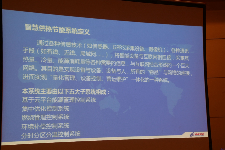 接下來(lái)我介紹的主題是,智慧供熱,綠色未來(lái),主題分為兩個(gè)部分,第一部分是,智慧供熱節(jié)能系統(tǒng),第二,節(jié)能產(chǎn)品介紹。首先介紹智慧供熱節(jié)能系統(tǒng),智慧供熱節(jié)能系統(tǒng)的定義是,通過(guò)各種傳感技術(shù)如傳感器,GPRS采集設(shè)備,攝像機(jī)各種通訊手段,如有線,無(wú)線,局域網(wǎng)將智能設(shè)備與互聯(lián)網(wǎng)相連接,采集其熱量,冷量,能源消耗量等各種需要的信息,與互聯(lián)網(wǎng)結(jié)合,形成一個(gè)巨大的網(wǎng)絡(luò),其目的是實(shí)現(xiàn)設(shè)備與設(shè)備,設(shè)備與人,所有的物品與網(wǎng)絡(luò)相連接,進(jìn)而實(shí)現(xiàn)量化管理,設(shè)備控制,營(yíng)運(yùn)維護(hù),一體化的一種系統(tǒng),本系統(tǒng)由一下五大子系統(tǒng)組成,基于云平臺(tái)能源管理系統(tǒng),集中優(yōu)化控制系統(tǒng),燃燒管理控制系統(tǒng),環(huán)境補(bǔ)償控制系統(tǒng),分時(shí)分區(qū)分溫控制系統(tǒng),請(qǐng)看智慧供熱節(jié)能系統(tǒng)的構(gòu)架圖,此系統(tǒng)分為四層,由全面感知層,節(jié)能設(shè)備管理層,可靠傳遞層,智能預(yù)算層組成,全面感知層的傳感器采集各種信息,設(shè)備管理層的控制器根據(jù)采集信息,對(duì)下層設(shè)備進(jìn)行良好的控制,并將數(shù)據(jù)打包成協(xié)議,以3D,4D因特爾等網(wǎng)絡(luò)形式傳遞到后臺(tái)的云服務(wù)器內(nèi),在云端進(jìn)行處理及信息分享,用戶可以通過(guò)計(jì)算機(jī)及智能手機(jī)瀏覽各種用能信息,從而形成了智慧供熱節(jié)能系統(tǒng),下面介紹第一個(gè)子系統(tǒng),基于云平臺(tái)能源管理控制系統(tǒng)是我公司根據(jù)國(guó)家有關(guān)導(dǎo)則要求而研發(fā)的企業(yè)耗能,公共建筑耗能等監(jiān)測(cè)管理系統(tǒng),該系統(tǒng)具有強(qiáng)大的途徑化管理功能,可以根據(jù)水,電,器及其他能源介質(zhì)的檢測(cè),系統(tǒng)土布圖生成圖形化虛擬界面,實(shí)現(xiàn)高度現(xiàn)場(chǎng)感的管理體驗(yàn),系統(tǒng)還支持多種控制工具,多媒體管理工具,數(shù)據(jù)庫(kù)管理工具等輔助功能,可方便實(shí)現(xiàn)能耗管理系統(tǒng)的詳細(xì)記錄及能耗趨勢(shì)管理功能,基于云平臺(tái)管理控制系統(tǒng)結(jié)合現(xiàn)代通訊技術(shù),與自動(dòng)化技術(shù),可以完成能源動(dòng)力系統(tǒng)相關(guān)設(shè)備在正常及事故情況下的監(jiān)測(cè),保護(hù),控制,可以完全以動(dòng)態(tài)圖形方式對(duì)各類能源消耗情況進(jìn)行實(shí)時(shí)監(jiān)控,通過(guò)相關(guān)儀表的采集,控制與通信功能,或與其他主流tcs,plc系統(tǒng),將能源動(dòng)力系統(tǒng)的各項(xiàng)運(yùn)行參數(shù)與狀態(tài)上傳,從而及時(shí)掌握耗能設(shè)備及用能單元的能源消耗,對(duì)其進(jìn)行有效監(jiān)管,以提高企業(yè)能源管理水平,和實(shí)現(xiàn)管理節(jié)能的目的,請(qǐng)看志誠(chéng)宏業(yè)能源管理系統(tǒng)軟件的訪問(wèn)界面,用戶可以通過(guò)瀏覽器直接訪問(wèn),無(wú)需進(jìn)行軟件預(yù)裝,非常方便,進(jìn)入軟件后,首先映入用戶眼簾的是界面一,項(xiàng)目的地理位置,運(yùn)行時(shí)間,各種能源節(jié)約數(shù)據(jù),及累計(jì)節(jié)約資金,一目了然,非常清晰,點(diǎn)擊進(jìn)入界面二后,用戶可以查閱項(xiàng)目簡(jiǎn)介及各種能源消耗的統(tǒng)計(jì)圖表,點(diǎn)擊進(jìn)入界面三后,軟件顯示了項(xiàng)目的3D圖像,當(dāng)用戶用鼠標(biāo)選中項(xiàng)目圖像時(shí),軟件會(huì)自動(dòng)顯示項(xiàng)目的各種監(jiān)測(cè)數(shù)據(jù),第二個(gè)子系統(tǒng),集中優(yōu)化控制系統(tǒng),集中優(yōu)化控制系統(tǒng)通過(guò)對(duì)系統(tǒng)所有檢測(cè)的參數(shù)進(jìn)行實(shí)時(shí)采集,對(duì)數(shù)據(jù)進(jìn)行在線存儲(chǔ),處理分析輸出報(bào)表等,實(shí)現(xiàn)對(duì)設(shè)備的監(jiān)測(cè)及控制,監(jiān)測(cè)中心可計(jì)算預(yù)測(cè)供熱負(fù)荷要求,根據(jù)運(yùn)營(yíng)工況,對(duì)監(jiān)測(cè)系統(tǒng)進(jìn)行鍋爐模糊負(fù)荷分配的優(yōu)化,分配本系統(tǒng)內(nèi)所需熱量,并確定其運(yùn)營(yíng)方式,平衡供熱需求,滿足末端用戶對(duì)熱量的最佳需求,第三個(gè)子系統(tǒng)是燃燒管理控制系統(tǒng),燃?xì)忮仩t燃燒機(jī)控制管理的研發(fā)過(guò)程中,利用燃燒尾氣中的含氧量來(lái)進(jìn)行燃燒過(guò)程中的控制與管理是最佳的方案,由于需要對(duì)燃料與空氣的比例進(jìn)行精確的調(diào)節(jié),使用機(jī)械連桿式的調(diào)節(jié)方法是難以做到的,所以我們提出了燃燒管理節(jié)能控制技術(shù),運(yùn)用復(fù)雜的集成電路與精度更高的伺服電機(jī)進(jìn)行氧氣與燃?xì)獾谋壤{(diào)節(jié),他可以根據(jù)實(shí)際生產(chǎn)中,煙氣、氧氣的變化與波動(dòng),而對(duì)空燃比進(jìn)行電子式的調(diào)節(jié),可實(shí)現(xiàn)節(jié)能率在3%以上,請(qǐng)看燃燒管理示意圖,根據(jù)煙氣中的含氧量,主控制器向執(zhí)行器發(fā)出指令,執(zhí)行器控制四氟電機(jī)精確調(diào)風(fēng)門和燃?xì)忾y,從而實(shí)現(xiàn)空氣與燃?xì)獾淖罴讶紵Ч?,今天的第二大部分,介紹本公司的節(jié)能產(chǎn