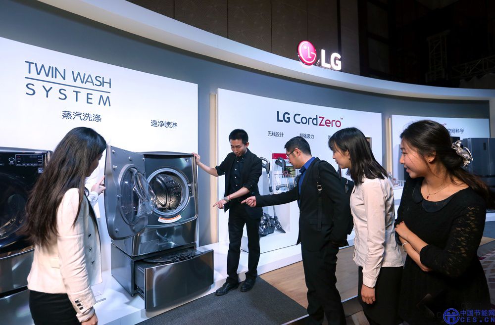 在LG展區(qū),我們可以看到雙門中門冰箱以及雙筒洗衣機(jī)的光芒。