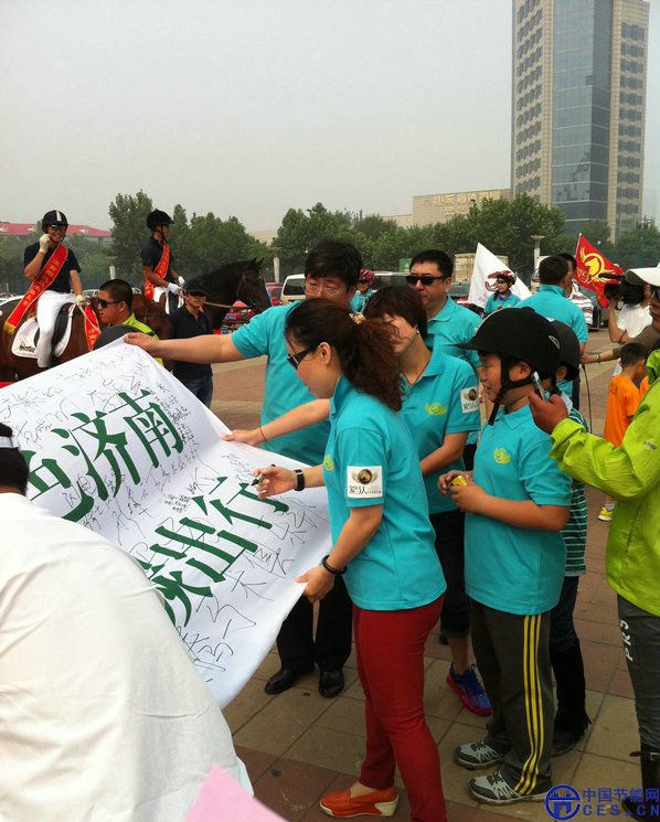 愛馬人士和市民在“綠色濟(jì)南 低碳出行”的旗幟上簽名