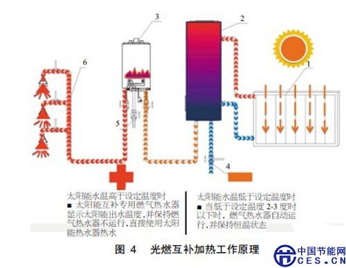 隨著人們生活水平的提高,消費(fèi)者對(duì)生活熱水的舒適性要求越來(lái)越高,很多用戶(hù)經(jīng)常抱怨太陽(yáng)能熱水器在冬天無(wú)法正常使用,就算可以出水,水溫也是忽冷忽熱,舒適度大打折扣。相較而言,太陽(yáng)能互補(bǔ)的最佳選擇是光燃互補(bǔ)(光燃互補(bǔ)加熱原理,詳見(jiàn)圖4)。