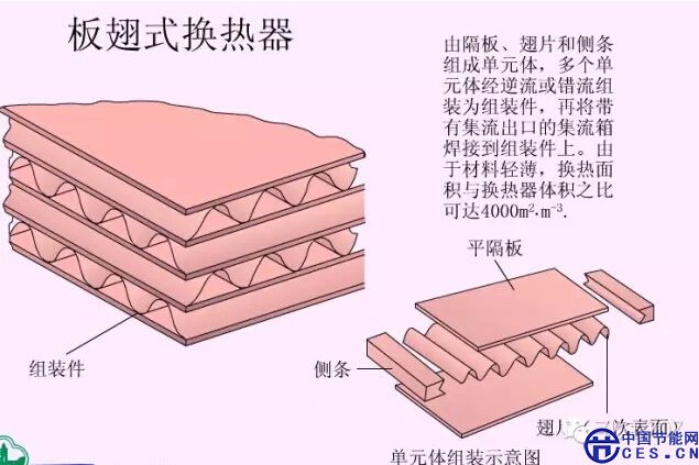 由隔板、翅片和側(cè)條組成單元體,多個(gè)單元體經(jīng)逆流或錯(cuò)流組裝為組裝件,再將帶有集流出口的集流箱焊接到組裝件 上。由于材料輕薄,換熱面積與換熱器體積之比可達(dá)4000㎡.m-3。