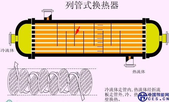 冷流體走管內(nèi),熱流體經(jīng)折流板走管外,冷、熱流體通過(guò)間壁換熱。