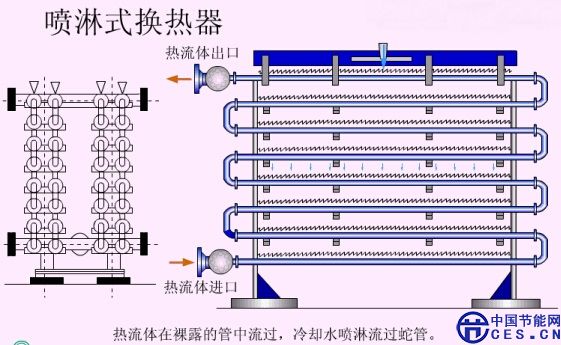 熱流體在裸露的管中流過(guò),冷卻水噴淋流過(guò)蛇管。