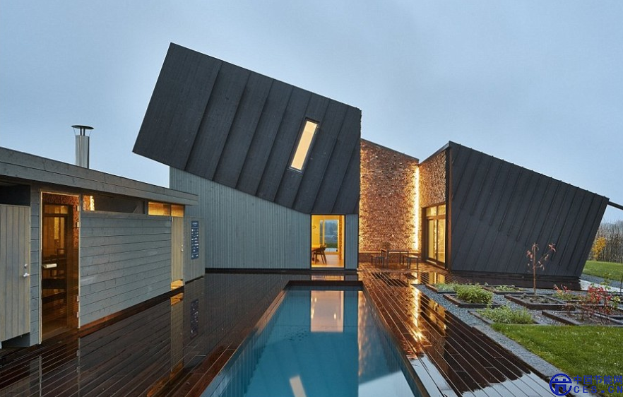 泳池和桑拿房:戶外泳池的水利用房屋的余熱來加溫,而桑拿房(圖左邊)則用木柴來加熱