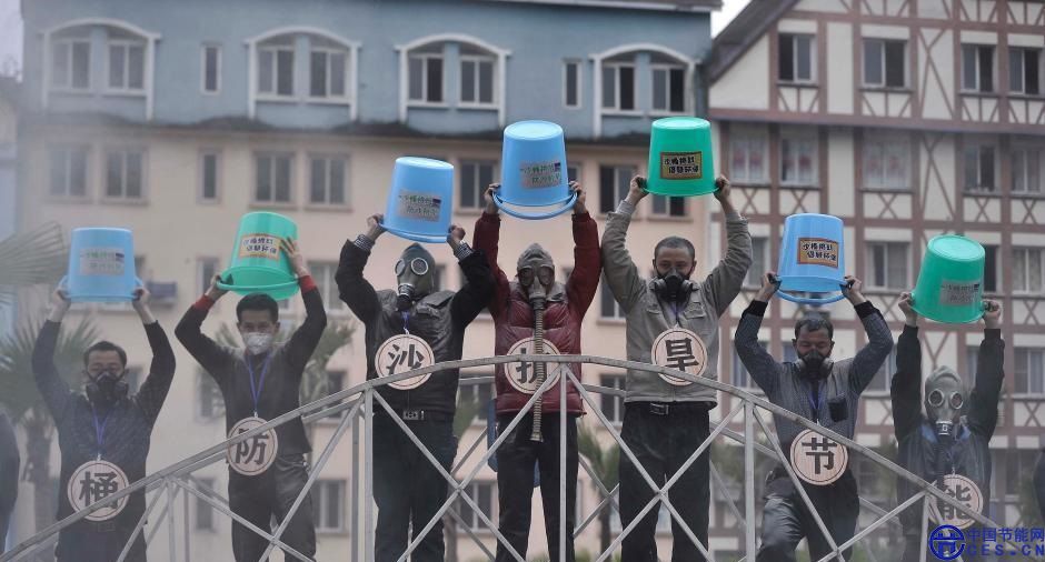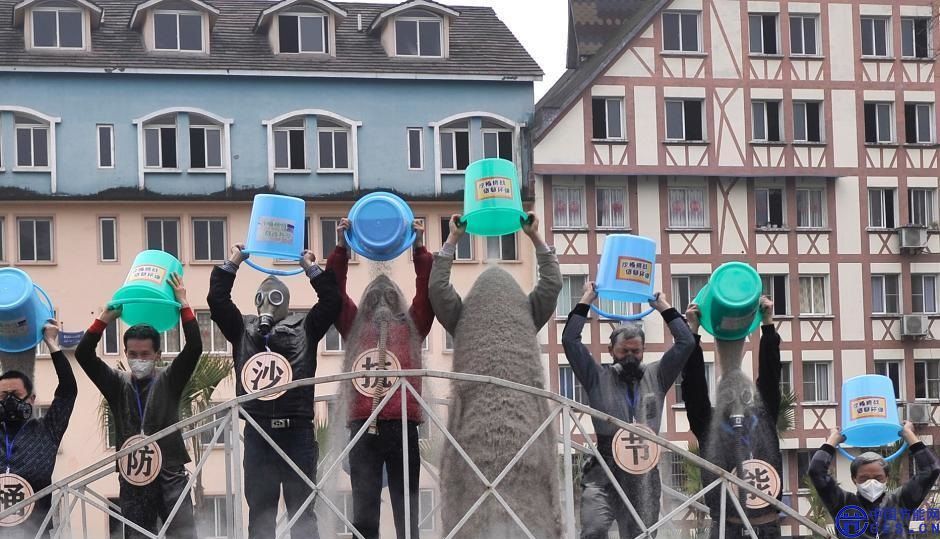 3月1日,重慶一景區(qū)10余位工作人員口戴防毒面罩,脖子上掛著“挑戰(zhàn)沙桶”、“防沙抗旱”、“節(jié)能減排”等標(biāo)語,將一桶桶沙從頭頂潑下,以夸張的行為藝術(shù)方式向游客展現(xiàn),呼吁市民共同保護(hù)環(huán)境。圖為工作人員將一桶桶沙從頭頂潑下。陳超 攝