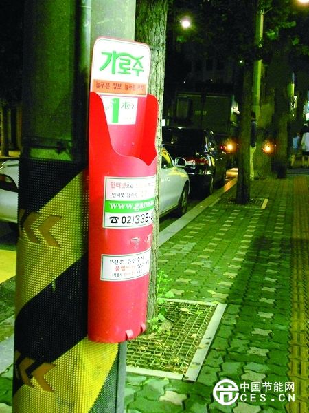 其實,首爾的街道上也不是完全沒有垃圾桶,只不過位置比較隱蔽。它不會被安置在繁華路段或大道兩邊,往往位于人流稀少的小路上,圖1中那個懸掛在燈柱上的小桶就是垃圾桶。