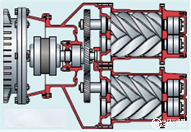 3) 將一級(jí)壓縮轉(zhuǎn)子和二級(jí)壓縮轉(zhuǎn)子組合在一個(gè)機(jī)殼內(nèi),并分別通過(guò)斜齒輪直接傳動(dòng),使每級(jí)轉(zhuǎn)子都能獲得最佳線速度,壓縮傳遞效率最高。