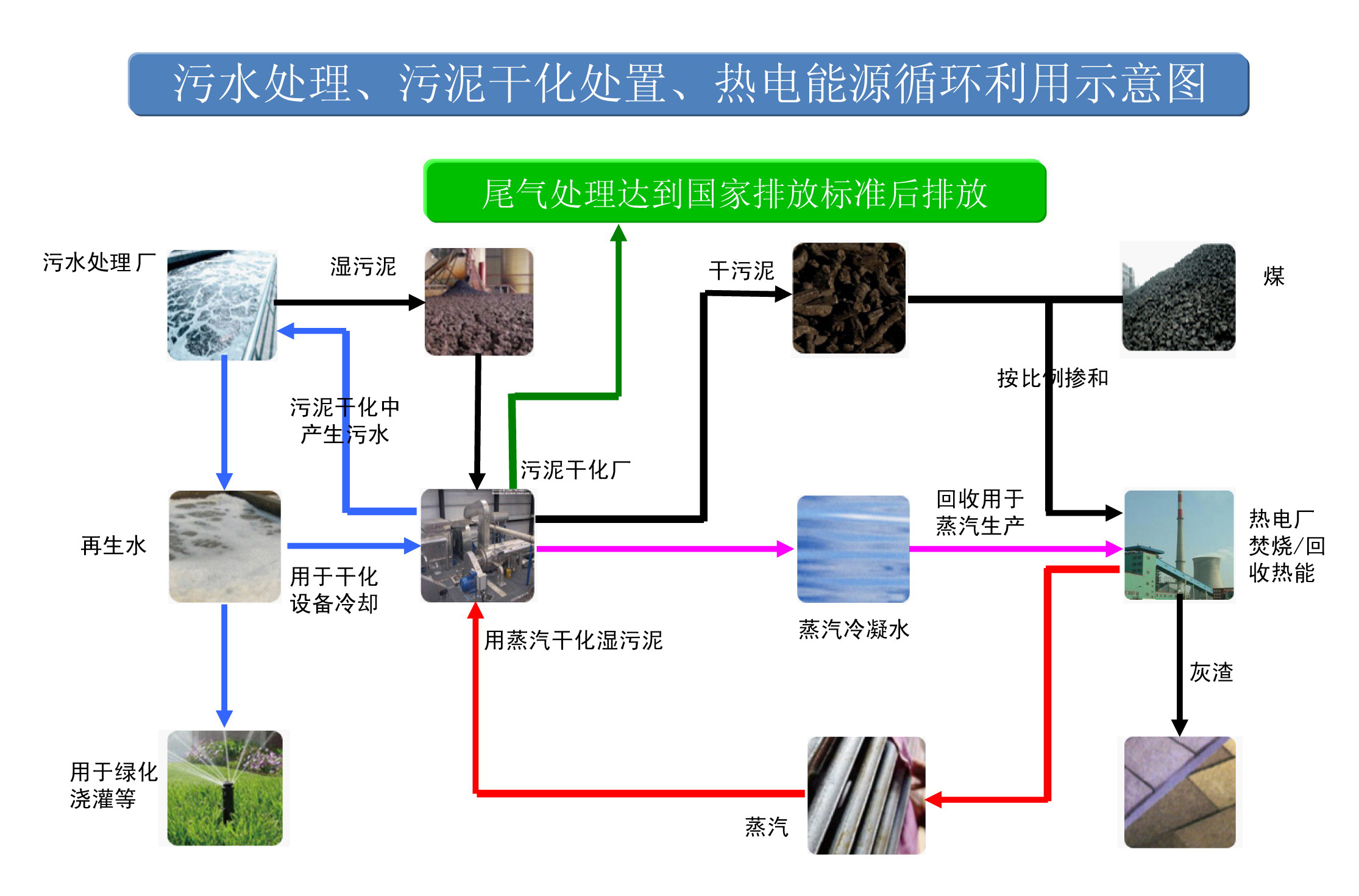 該工程由園區(qū)第二污水處理廠、污泥資源化和綜合利用項(xiàng)目以及現(xiàn)代化標(biāo)準(zhǔn)敷設(shè)的管網(wǎng)三部分有機(jī)構(gòu)成。蘇州工業(yè)園區(qū)第二污水處理廠通過(guò)現(xiàn)代化標(biāo)準(zhǔn)敷設(shè)的管網(wǎng)收集園區(qū)污水;污水處理產(chǎn)生的濕污泥送入蘇州工業(yè)園區(qū)中法環(huán)境技術(shù)有限公司的污泥干化廠房進(jìn)行干化處理;干化后的污泥再送入鄰近東吳熱電廠與煤攪拌混合后焚燒發(fā)電,焚燒后的灰渣用于制造建筑材料。在此過(guò)程中,污泥干化產(chǎn)生的污水回送到第二污水處理廠進(jìn)行處理,污水處理廠產(chǎn)生的再生水還可用于污泥干化廠的設(shè)備冷卻和廠區(qū)綠化澆灌等。