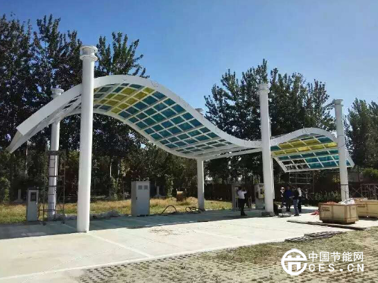 安裝了漢能BIPV組件的國家電網(wǎng)華商三優(yōu)的充電車棚,每年發(fā)電量約1.5萬度