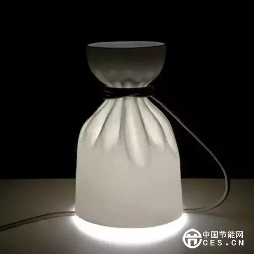 還記得小時(shí)候?qū)⑽灮鹣x(chóng)放在透明的袋子里照明嗎?這款燈的設(shè)計(jì)正試圖將人們從科技帶入自然感的光亮中。將薄陶瓷塑形成一個(gè)收緊狀的口袋,將燈的電源線(xiàn)用皮革包裹起來(lái),看起來(lái)就像是皮繩捆綁著袋口。