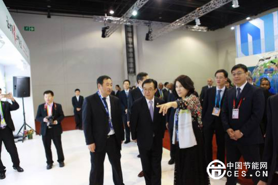 國家商務(wù)部部長高虎城參觀格力展位,格力董事長董明珠為其介紹展位情況。