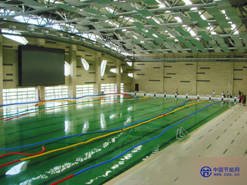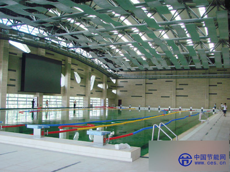 莆田市游泳健身館是第十四屆省運會比賽場館之一,坐落在該市體育中心南區(qū),綜合體育館東側,占地面積76畝,建筑面積1.6萬平方米,投資近1.47億元。場館內建有比賽池與練習池,比賽池:50m×25m,平均水深2.1m,10泳道標準游泳池。設有活動坐席500座。練習池為標準10m×25m,游泳池采用外溢式排水,以減少水波回浪阻力影響游泳運動員游泳成績。游泳館不僅外墻全部采用隔熱防輻射的中空落地玻璃,對水處理系統(tǒng)也作了巧妙設計。屋面鋪滿了太陽能集熱板,用太陽能集熱板收集的熱量和中央空調所產生的熱量,對游泳池的水進行加熱。