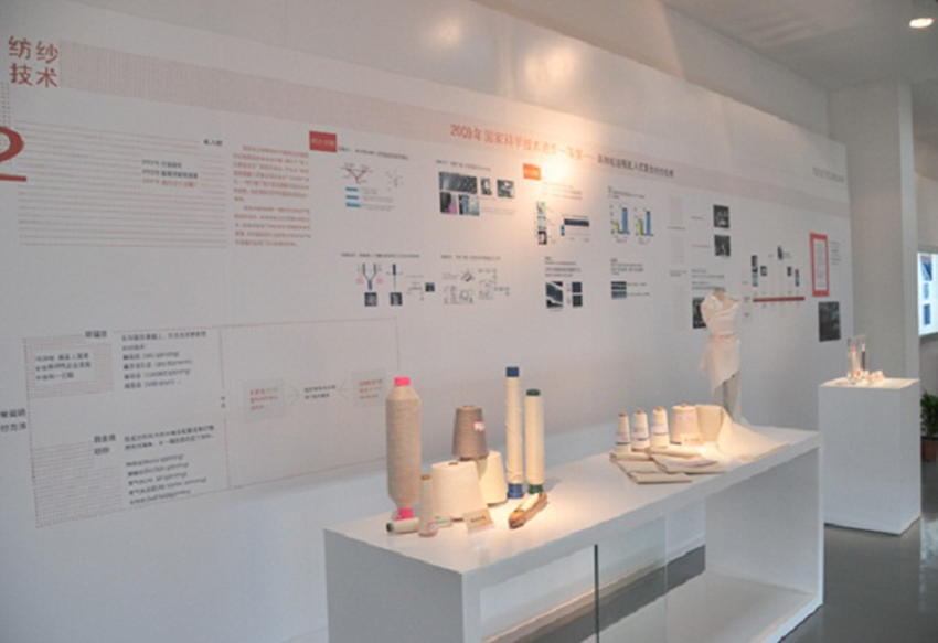 “紡紗技術(shù)”展區(qū)首先分析了環(huán)錠紡、自由端紡紗等常規(guī)紡紗技術(shù)及其不足,詳細(xì)介紹了武漢紡織大學(xué)徐衛(wèi)林教授主持研發(fā)的“高效短流程嵌入式復(fù)合紡紗技術(shù)”及其四大創(chuàng)新、四大突破,并通過與環(huán)錠紡技術(shù)的對比,凸顯了嵌入紡技術(shù)的先進(jìn)性。這項被中國紡織工業(yè)協(xié)會杜鈺洲會長盛贊為“對傳統(tǒng)紡紗技術(shù)一次革命性突破”的技術(shù),獲得了2009年度國家科技進(jìn)步一等獎。此外,該展區(qū)還展示了武漢紡織大學(xué)自主研發(fā)的柔潔紡技術(shù)、無PVA上漿技術(shù)等原創(chuàng)性紡紗、漿紗技術(shù),彰顯出武漢紡織大學(xué)在該領(lǐng)域中突出的研究能力。