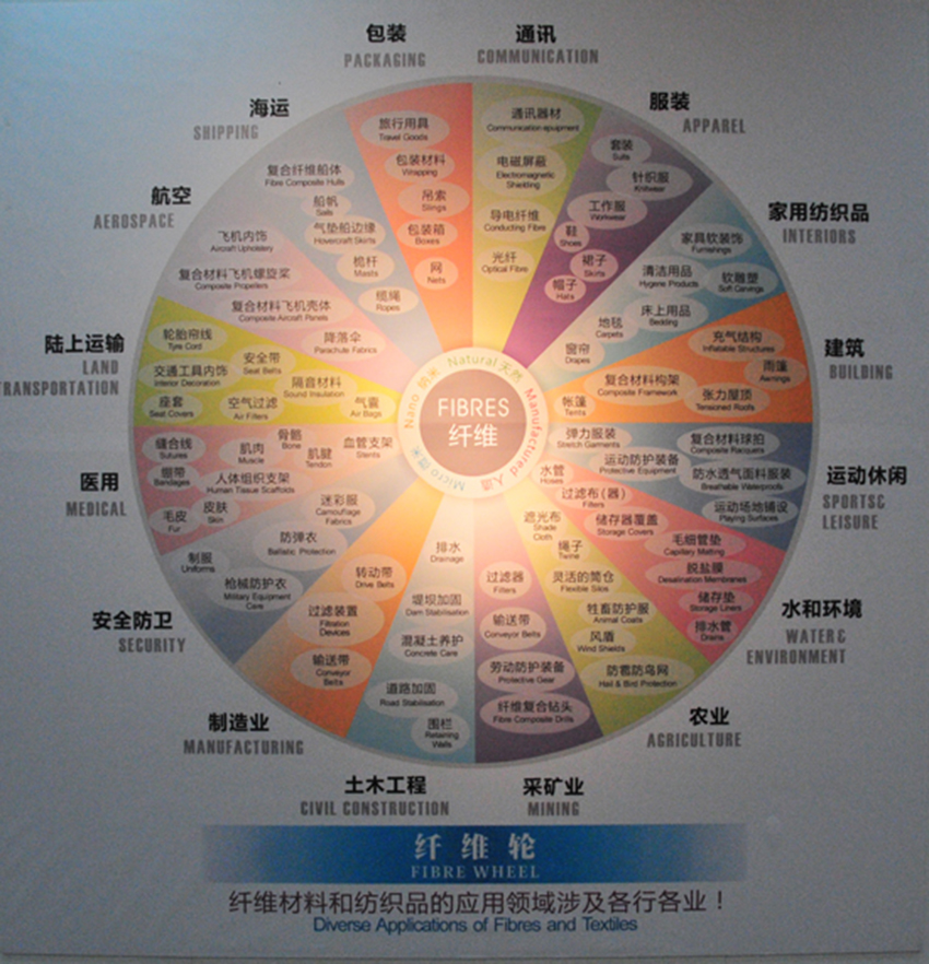 “紡織原料”展區(qū)在簡要介紹天然纖維和化學(xué)纖維兩類紡織原料的基礎(chǔ)上,重點介紹了武漢紡織大學(xué)在在紡織原料研究方面的突出成果——2008年獲得國家技術(shù)發(fā)明二等獎的“優(yōu)質(zhì)天然高分子材料超細(xì)粉體化及其高附加值的再利用”,以及在海藻酸系列功能纖維、聚苯硫醚纖維、構(gòu)樹纖維等新原料領(lǐng)域的研究開發(fā)成果與應(yīng)用情況。巨大的纖維輪顯示,紡織產(chǎn)品的應(yīng)用范圍已經(jīng)大大超越“衣被天下”的民生領(lǐng)域,擴大到航空、航天、水利、農(nóng)業(yè)、交通、醫(yī)療等眾多領(lǐng)域,因此,紡織研究也在打破原有的學(xué)科和行業(yè)界限,相關(guān)學(xué)科的交叉研究是大勢所趨。正是基于此,武漢紡織大學(xué)以紡織特色整合理、工、文(藝)、經(jīng)、管、法、教育等各學(xué)科,形成了多學(xué)科交叉、相互支撐、相互協(xié)調(diào)、特色鮮明的6大學(xué)科群,即紡織工程與材料學(xué)科群、環(huán)境與化學(xué)化工學(xué)科群、機電信息學(xué)科群、理學(xué)基礎(chǔ)學(xué)科群、人文藝術(shù)學(xué)科群、管理學(xué)科群,各學(xué)科群呈現(xiàn)可持續(xù)發(fā)展的良好局面。
