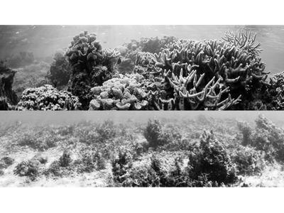 海洋保護(hù)區(qū)內(nèi)的珊瑚礁(上)和允許捕魚(yú)的藻類覆蓋的珊瑚礁(下)。圖片來(lái)源:《自然—生態(tài)與進(jìn)化》
