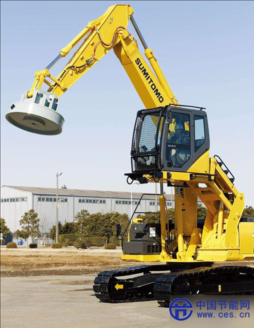 住友建機繼成功研發(fā)LEGEST系列履帶式液壓挖掘機之后,2009年發(fā)售世界首創(chuàng)的混合動力磁盤起吊式挖掘機。磁盤起吊式挖掘機主要用于處理碎鋼鐵作業(yè),由于機械工作時間長,用于能源回收的機械本體旋轉(zhuǎn)頻度高,適合混合動力技術(shù)的采用。與普通同噸位磁盤起吊式挖掘機相比節(jié)能高達40%。