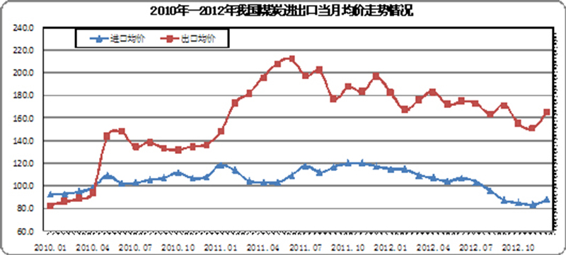 由于國(guó)際煤價(jià)低于國(guó)內(nèi),同時(shí)考慮到我國(guó)相關(guān)稅率政策的調(diào)控,2012年我國(guó)煤炭出口量持續(xù)保持低位。全年只有1、2、5三個(gè)月煤炭當(dāng)月出口量超過(guò)100萬(wàn)噸,出口量最少的10月份僅有44萬(wàn)噸。全年煤炭出口總量不足1000萬(wàn)噸,僅有926萬(wàn)噸,較去年同期減少539.2萬(wàn)噸,下降36.8%。12月份當(dāng)月出口均價(jià)為165.7美元/噸,比去年同期下降31美元/噸,比1月份下降了16.6美元/噸,比上月增長(zhǎng)14.5美元/噸;當(dāng)月出口金額僅為13585萬(wàn)美元,同比下降13.6%。全年累計(jì)出口金額由去年的27.16億美元降至15.86億美元,下降41.6%,累計(jì)出口均價(jià)為173.3美元/噸,同比下降14美元/噸。我國(guó)煤炭全年實(shí)現(xiàn)凈進(jìn)口27925噸,同比增加11151萬(wàn)噸,增長(zhǎng)高達(dá)66.5%。