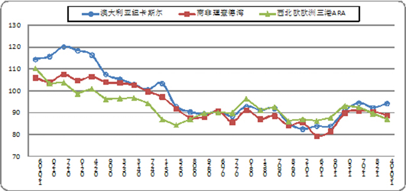 國(guó)際方面,三大港動(dòng)力煤價(jià)格指數(shù)全年也基本處在下行通道當(dāng)中,截止到12月28日,紐卡斯?fàn)柛壑笖?shù)為92.25美元/噸,比年內(nèi)最高點(diǎn)時(shí)1月末的120.03美元/噸下跌了27.8美元/噸,跌幅23.2%,年內(nèi)最低價(jià)位出現(xiàn)在10中旬為82.5美元/噸;南非理查德港指數(shù)年末報(bào)收于90.5美元/噸,比1月末高位時(shí)的107.49美元/噸下跌了16.9美元,跌幅為16.2%,年內(nèi)最低價(jià)位為10月末的79.3美元/噸;歐洲三港ARA指數(shù)年末為89.5美元/噸,比一月末的103.75美元/噸下跌了14.25美元/噸,下跌13.7%,年內(nèi)價(jià)格最低時(shí)為86.17美元/噸。