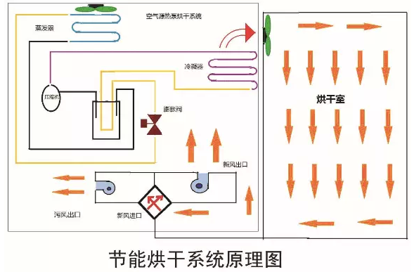 制冷劑被壓縮機(jī)加熱,成為高溫高壓氣體,進(jìn)入冷凝器,冷凝液化放熱,成為液體,同時(shí)將烘干房空氣加熱,從而達(dá)到提高烘干房溫度的目的。通過熱風(fēng)的形式使物料中的水分汽化蒸發(fā),蒸發(fā)出來的水蒸氣由排濕系統(tǒng)排走而達(dá)到烘干的目的。