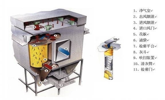 從鍋爐出來(lái)(或需要處理)的原煙氣,進(jìn)入除塵器進(jìn)風(fēng)煙道,分別均流分配進(jìn)入各過(guò)濾單元,這樣即形成幾個(gè)獨(dú)立的布袋除塵室,通過(guò)過(guò)濾的凈煙氣匯合到出風(fēng)煙道外排。根據(jù)需要在進(jìn)風(fēng)煙道和出風(fēng)煙道之間可設(shè)置內(nèi)旁路裝置。具體參見(jiàn)如下示意圖