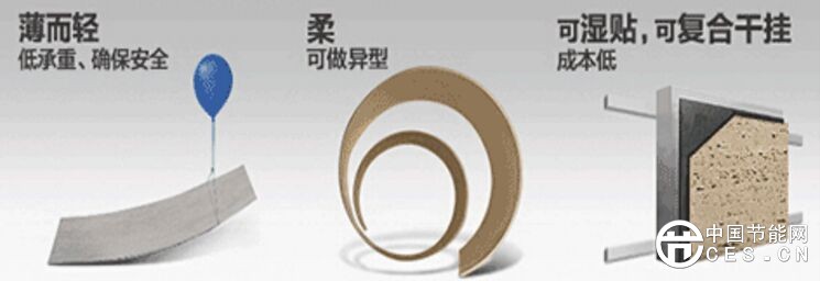 針對(duì)普通硅酸鈣板和水泥壓力板在自重上的劣勢(shì),地平線公司研發(fā)出第三代復(fù)合產(chǎn)品—軟石保溫裝飾一體板。它是以水溶性高分子聚合物和助劑為面層材料,以高分子聚合物和無(wú)機(jī)顏料為底層,經(jīng)自動(dòng)化復(fù)合成型的一種富有彈性的薄而輕的新型建材,簡(jiǎn)化了現(xiàn)場(chǎng)施工的步驟和麻煩。