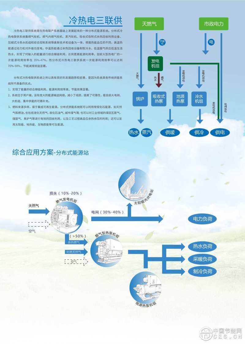 冷熱電三聯(lián)供系統(tǒng)是以燃?xì)鉃槟茉?,通過對其產(chǎn)生的熱水和高溫廢氣的利用,以達(dá)到冷-熱-電需求的一個能源供應(yīng)系統(tǒng),通常由發(fā)電機(jī)組、溴化鋰制冷裝置、熱交換裝置組成,三聯(lián)供使得燃?xì)獾臒崮鼙怀浞掷茫蟠筇岣吡四茉吹木C合利用功效。