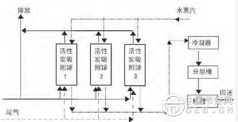 技術(shù)原理:當(dāng)有機(jī)廢氣通過活性炭顆粒時,其中的有機(jī)物被顆粒碳的微孔吸附、截留,空氣則得以凈化后排放。在吸附飽和后,采用高溫蒸汽脫附法,將吸附在活性炭顆??讖絻?nèi)的有機(jī)分子脫附出來并回收。