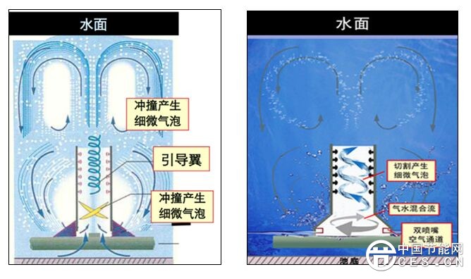 氣體從底部進(jìn)入,通過氣體高速作用,混合液在筒內(nèi)、外循環(huán)流動(dòng),氣液上升過程中,在筒內(nèi)部產(chǎn)生多次切割,形成極微小氣泡。氣液充分混合及不斷循環(huán)對流,增強(qiáng)了氧傳遞速率和利用率。