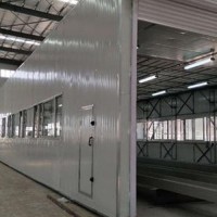 整體移動式噴漆間的設(shè)計目的,是為了滿足較大型工件 打磨或噴漆的需要。噴漆房整體為框架式結(jié)構(gòu),表面噴塑,框架之間由阻燃巖棉板鏈接密封,外形美觀大方,安裝快捷方便,價格低廉,運行平穩(wěn)可靠。一般情況下每套房體對應(yīng)2~3個排風(fēng)凈化工位,哪個工位上的工件需要噴漆時,房體則行走移動到那個工位,其他工位可以繼續(xù)打磨工作,待 房體內(nèi)的工件噴漆完畢后,再控制移動房體行走到打磨完畢后的工件工位,如此設(shè)計可以實現(xiàn)大型工件的不間斷連續(xù)噴漆工作。房體為鋼結(jié)構(gòu)構(gòu)造,房體立柱下面設(shè)置有兩臺電動驅(qū)動行走機(jī)構(gòu),行走機(jī)構(gòu)沿地面軌道行走。移動房體兩端設(shè)置有電動卷簾大門,房體行走時,大門升起,待到達(dá)位置時,大門降落關(guān)閉。大門與行走機(jī)構(gòu)由電氣控制部分連鎖控制,大門升起后,房體才可移動行走。